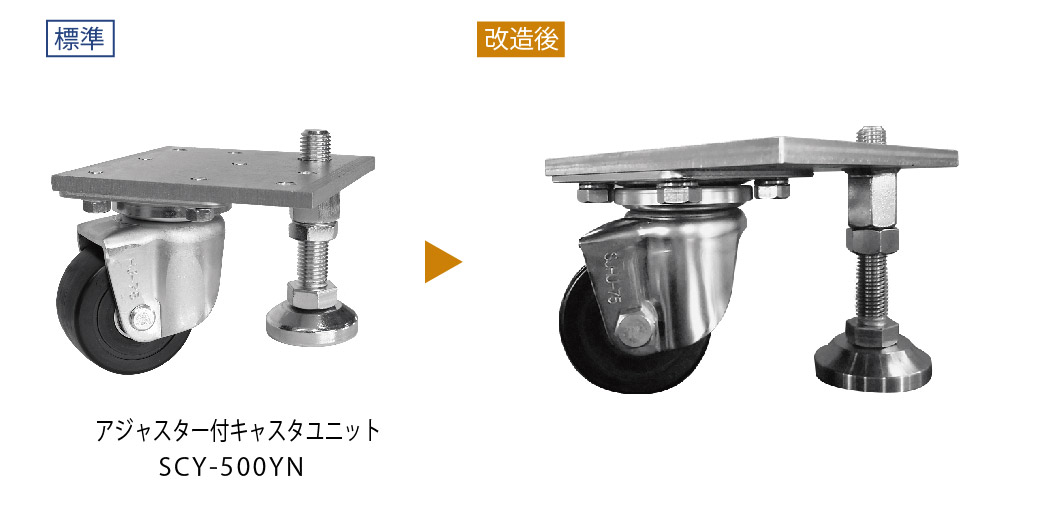 アジャスター付キャスタユニットの金具部分をオールステンレスで作成しました。