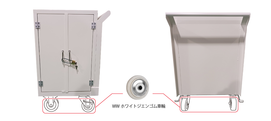 金庫付き台車 【特徴】 百貨店の催事場で使用された観音扉式の金庫付き台車です。車輪には高弾性・ノンマーキング性に優れたホワイトジエンゴムを採用。後輪のキャスタはストッパー付きです。 キャスタの詳細はこちら▼ 前輪:WWK-130(固定キャスタ) 後輪:WWJB-130(自在旋回ダブルストッパー付キャスタ)/ WWJBL-130(自在旋回ダブルストッパー㊧付キャスタ)